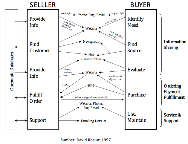 Dengan bermodalkan sebuah website atau homepage, penjual (seller) dapat memberikan berbagai informasi sehubungan dengan profil usaha dan produk atau jasa yang ditawarkan. Di sisi konsumen sebagai calon pembeli (buyers), internet menyediakan akses secara luas dan bebas terhadap semua perusahaan yang telah ++ mendaftarkan+++ diri di dunia maya. Pertukaran informasi dalam arena ini dapat dilakukan secara satu arah maupun interaktif melalui beragam produk elektronik, seperti komputer, telepon, faks, dan televisi. Proses bisnis pertama di dalam sistem E-Commerce ini dinamakan sebagai ++ information sharing+++. Prinsip penjual di dalam proses ini adalah untuk mencari dan menjaring calon pembeli sebanyak-banyaknya, sementara prinsip pembeli adalah berusaha sedapat mungkin mencari produk atau jasa yang diinginkannya, dan mencoba untuk mencari tahu penilaian orang lain terhadap produk atau jasa tersebut.