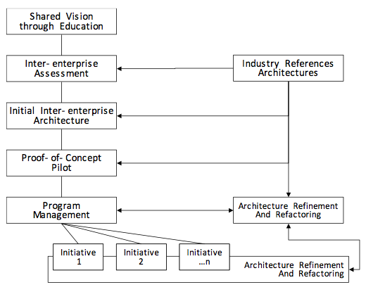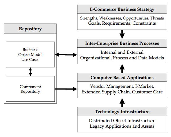 Dalam berbagai teori manajemen dikatakan bahwa skenario pengembangan teknologi informasi harus sejalan dengan strategi bisnis perusahaan. Sejalan dalam arti kata bahwa dalam tataran strategis dan aktivitas operasional, pengembangan teknologi informasi semacam E-Commerce harus berada dalam kerangka arsitektur bisnis perusahaan. Eberhardt Rechtin mendefinisikan arsitektur bisnis perusahaan sebagai penggabungan antara tiga komponen besar, yaitu: organisasi, proses, dan teknologi.