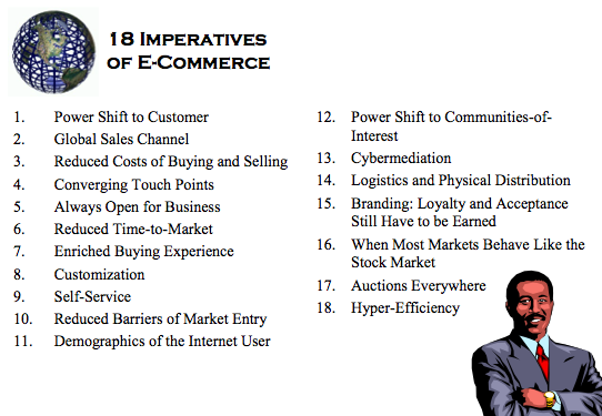 Dalam bukunya ++ Enterprise E-Commerce+++, Peter Fingar, Harsha Kumar dan Tarun Sharma secara gamblang menjelaskan 18 imperatif yang mencirikan keberadaan e-commerce dalam dunia bisnis (Fingar, 2000).