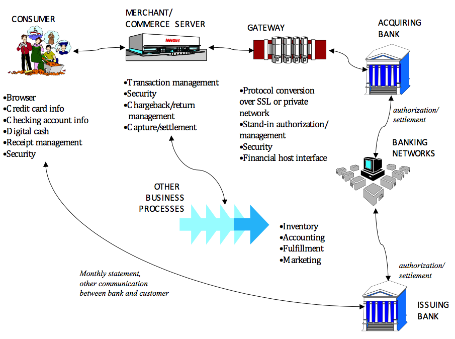 Salah satu isu terbesar dalam implementasi sistem E-Commerce adalah mengenai mekanisme transaksi pembayaran via internet. Dalam bisnis konvensional sehari-hari, seseorang biasa melakukan pembayaran terhadap produk atau jasa yang dibelinya melalui berbagai cara. Cara yang paling umum adalah dengan membayar langsung dengan alat pembayaran yang sah (uang) secara tunai (cash). Cara lain adalah dengan menggunakan kartu kredit (credit card), kartu debit (debet card), cek pribadi (personal check), atau transfer antar rekening (Kosiur, 1997).