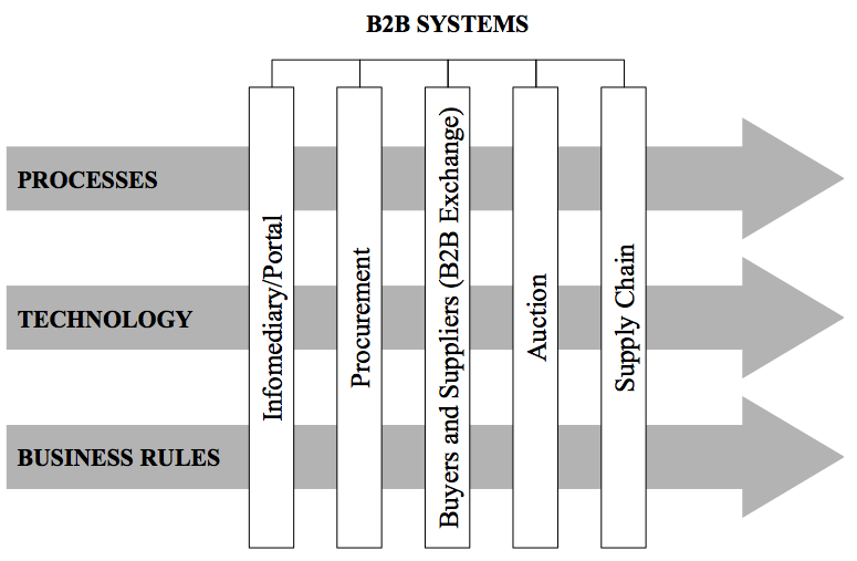 Forrester Research Inc., sebuah lembaga riset terkemuka di Cambridge - Massachusetts, melaporkan bahwa nilai pasar potensial untuk tipe bisnis e-commerce B2B masih jauh lebih besar dibandingkan dengan tipe B2C. Diperkirakan bahwa pada tahun 2002, di Amerika Serikat saja, nilainya dapat mencapai US$ 3,8 miliar, suatu angka yang sangat fantastis. Tingginya nilai ini tidak hanya disebabkan karena besarnya potensi pasar yang ada, namun disebabkan pula karena tingkat kompleksitas yang lebih tinggi dibandingkan dengan jenis B2C. Dari berbagai jenis model bisnis B2B yang ada, terlihat bahwa tiga jenis akan mendominasi pasar, yaitu model: Enterprise Portals, Extranet, dan Virtual Markets (Rymer, 1999).