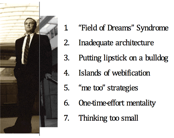 Melakukan bisnis di dunia maya (e-commerce) sama sekali berbeda dengan mengelola perusahaan konvensional. Selain dibutuhkan ketekunan dan kreativitas yang terus-menerus, strategi yang tepat perlu disusun dan dikembangkan agar keunggulan kompetitif yang dimiliki dapat terus dipelihara dan ditingkatkan. Statistik mencatat bahwa dari seluruh perusahaan berbasis internet yang tumbuh, hanya sekitar 20% yang mampu bertahan untuk beroperasi dalam periode waktu yang cukup panjang. Amir Hartman dan rekan-rekan dalam bukunya ++ Net Ready+++ menemukan 7 (tujuh) kesalahan mendasar yang menyebabkan terjadinya kegagalan bagi mayoritas pelaku bisnis e-commerce yang ada di dunia (Hartman, 2000). Dikatakan mendasar karena hampir seluruh situs yang ++ mati+++ melakukan satu atau lebih kesalahan umum tersebut. Berikut adalah penjelasan ringkas mengenai kesalahan-kesalahan terkait.