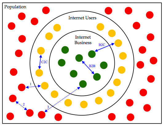 Kebanyakan dari mereka yang ingin terjun untuk berbisnis di dunia maya mempertanyakan seberapa besar potensi pasar (potensial market) yang ada. Banyak yang sadar, bahwa pasar terbesar masih didominasi oleh negara-negara maju seperti Amerika Serikat, Jepang, Cina, Inggris, Jerman, dan lain-lain. Praktisi bisnis tersebut menilai bahwa di negara-negara tersebutlah ratio antara jumlah penduduk, jumlah komputer, dan jumlah pengguna internet memiliki ranking yang tinggi. Sehingga mereka beranggapan, bahwa probabilitas terjadinya transaksi melalui medium internet akan tinggi pula.