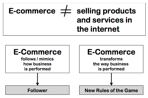 Kesalahan terbesar yang sering dilakukan para praktisi bisnis adalah mendefinisikan e- commerce sebagai ++ cara menjual produk atau jasa di internet+++. Tentu saja pengertian ini merupakan hal yang sangat sempit jika dilihat dari karakteristik dan potensi bisnis yang ditawarkannya. Secara prinsip, potensi e-commerce berada dalam sebuah spektrum dengan dua buah titik ekstrem.