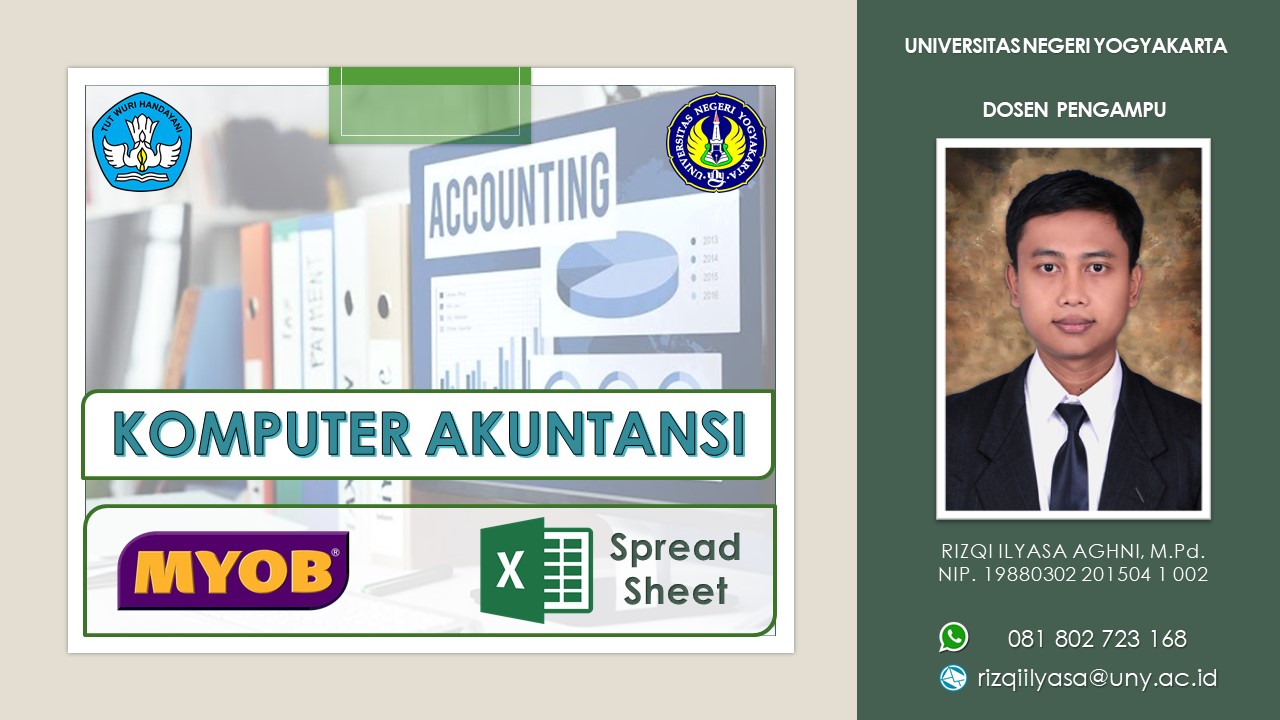 Selamat datang para peserta perkuliahan Komputer Akuntansi. Selama 200 menit ke depan anda akan dibersamai oleh dosen matakuliah ini dan juga menggunakan semua media dan bahan perkuliahan yang telah disiapkan pada Be-Smart ini. Selamat mengikuti perkuliahan, dan semoga sukses.