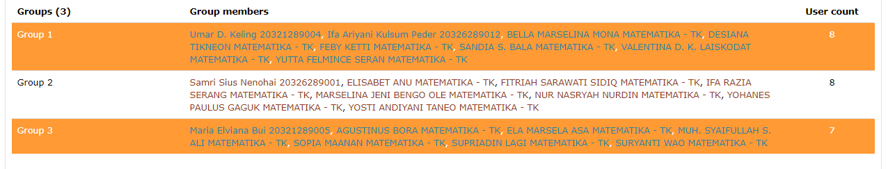 Quiz ini berupa kelompok. Kerjakan quiz dengan mendiskusikan dengan satu kelompok. Jika kalian kesulitan, kalian juga dapat berdiskusi dengan tutor. Berikut merupakan pembagian kelompoknya.