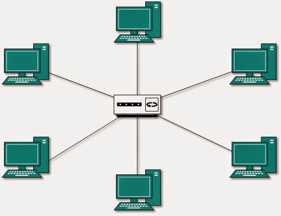 Topologi ini membentuk seperti bintang karena semua komputer di hubungkan ke sebuah hub atau switch dengan kabel UTP, sehingga hub/switch lah pusat dari jaringan dan bertugas untuk mengontrol lalu lintas data, jadi jika komputer 1 ingin mengirim data ke komputer 4, data akan dikirim ke switch dan langsung di kirimkan ke komputer tujuan tanpa melewati komputer lain. Topologi jaringan komputer inilah yang paling banyak digunakan sekarang karena kelebihannya lebih banyak.